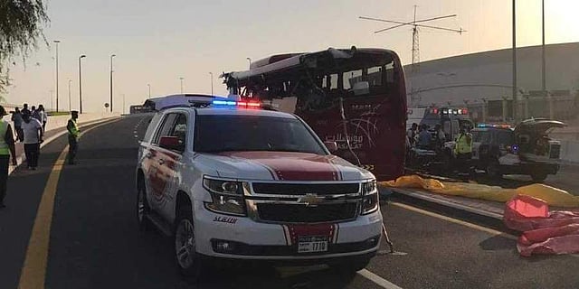 துபாயில் ஐ ரஷிதியா மெட்ரோ ரயில் நிலையத்துக்கு அருகே பேருந்துகள் நுழைவதற்கு வசதி இல்லா குறுகிய சாலையில் நுழைந்த ஆம்னி பேருந்து, சாலையோரம் இருந்த தடுப்பில் வேகமாக மோதியதில் பேருந்தில் இருந்த 17 பேர் பலியாகினர். 9 பேர் படுகாயம் அடைந்தனர்.