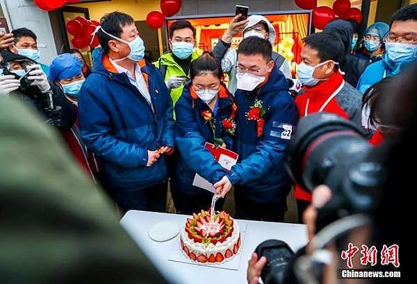 மணமகனும் மணமகளும் ஷாங்ஹாய் ரென் ஜி மருத்துவமனையில் பணியாற்றும் செவிலியர்களாவர்கள். 10 நாட்களுக்கு முன், அவர்கள் வூஹானைச் சென்றடைந்தனர்.