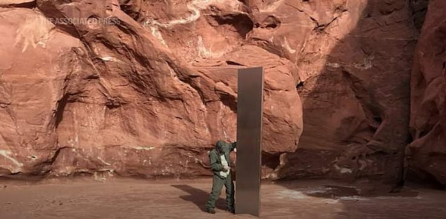 உட்டாவின் ரெட் ராக் பாலைவனத்தில் இரண்டு ஆள் உயர ஒளிரும் உலோகப் பொருள் கண்டுபிடிக்கப்பட்டுள்ளது.