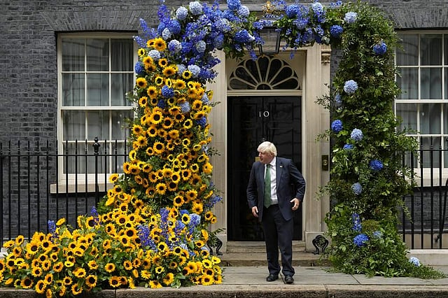 பிரிட்டன் பிரதமர் போரிஸ் ஜான்சனின் 'டவுனிங் ஸ்ட்ரீட்' அலுவலக முகப்பு முழுவதும் உக்ரைன் கொடியில் இடம்பெற்றுள்ள நிறங்களான மஞ்சள் மற்றும் ஊதா நிற பூக்கள் கொண்டும் உக்ரைனின் தேசிய மலரான சூரிய காந்தி மலர்களாலும் அலங்கரிக்கப்பட்டுள்ளது.