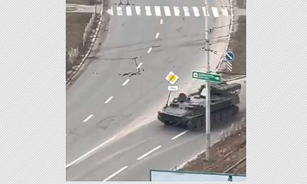 கீவ் நகருக்குள் தரைவழியாக நுழைந்த ரஷிய பீரங்கி ஒன்று, சாலையில் சென்று கொண்டிருந்த தனி நபரின் காரை, வேகமாகச் சென்று மோதி அப்பளமாக நொறுக்கியது.