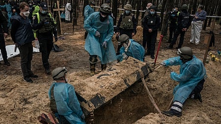 ரஷியப் படையினரிடமிருந்து மீட்கப்பட்ட உக்ரைனின் இஸியம் நகரில் கண்டறியப்பட்டுள்ள புதை குழிகளிலிருந்து சடலங்களைத் தோண்டியெடுக்கும் பணி தொடங்கப்பட்டுள்ளது.