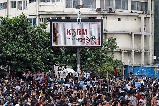 வங்கதேச தலைநகர் டாக்காவில் திங்கள்கிழமை நடைபெற்ற போராட்டம். AP