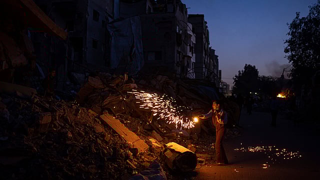இஸ்ரேல் தாக்குதலில் தகர்ந்த மசூதி கட்டடங்களுக்கு வெளியில் மக்கள் வழிபாடு மேற்கொள்கின்றனர். அலங்கார விளக்குகள் மற்றும் தோரணங்கள் தற்காலிக குடியிருப்புகளில் சூழ்ந்துள்ளன.
