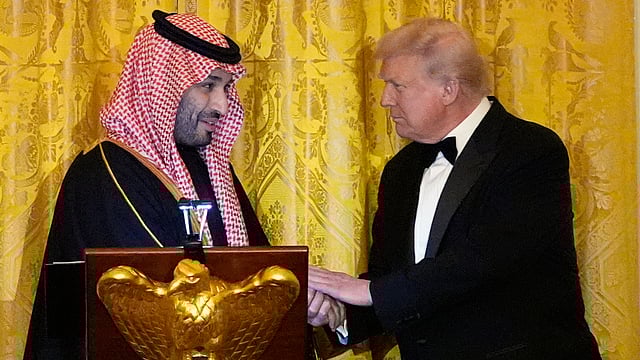 வெள்ளை மாளிகையின் தெற்கு வாயில் வழியாக வந்த சௌதி அரேபியாவின் பட்டத்து இளவரசர் முகமது பின் சல்மான், தி ஓவல் அலுவலகத்தில் செய்தியாளர்களின் கேள்விகளுக்கு அதிபர் டிரம்ப்புடன் சேர்ந்து பதிலளித்தார்.