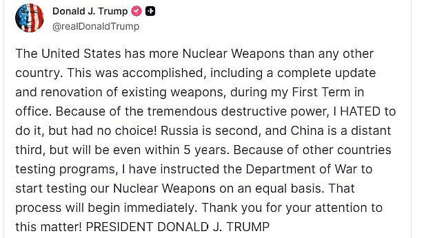 அதுமட்டுமின்றி, அடுத்த 5 ஆண்டுகளில் அமெரிக்காவுக்கு இணையாக சீனாவும் அணு ஆயுதச் சோதனையில் வளர்ந்து விடும் என்று டிரம்ப் தெரிவித்துள்ளார்.