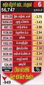 ‘கரடி’ பிடி இறுகியது: காலையில் சென்செக்ஸ் 81.55 புள்ளிகள் கூடுதலுடன் 57,778.01-இல் தொடங்கி அதிகபட்சமாக 57,781.46 வரை மட்டுமே உயா்ந்தது. பின்னா், பங்குகள் விற்பனை அதிகரித்ததும் 56,687.62 வரை கீழே சென்ற சென்செக்ஸ், இறுதியில் 949.32 புள்ளிகள் (1.65 சதவீதம்) குறைந்து 56,747.14-இல் நிலைபெற்றது. நாள் முழுவதும் சந்தையில் ‘கரடி’யின் ஆதிக்கம் வலுவாக இருந்தது.