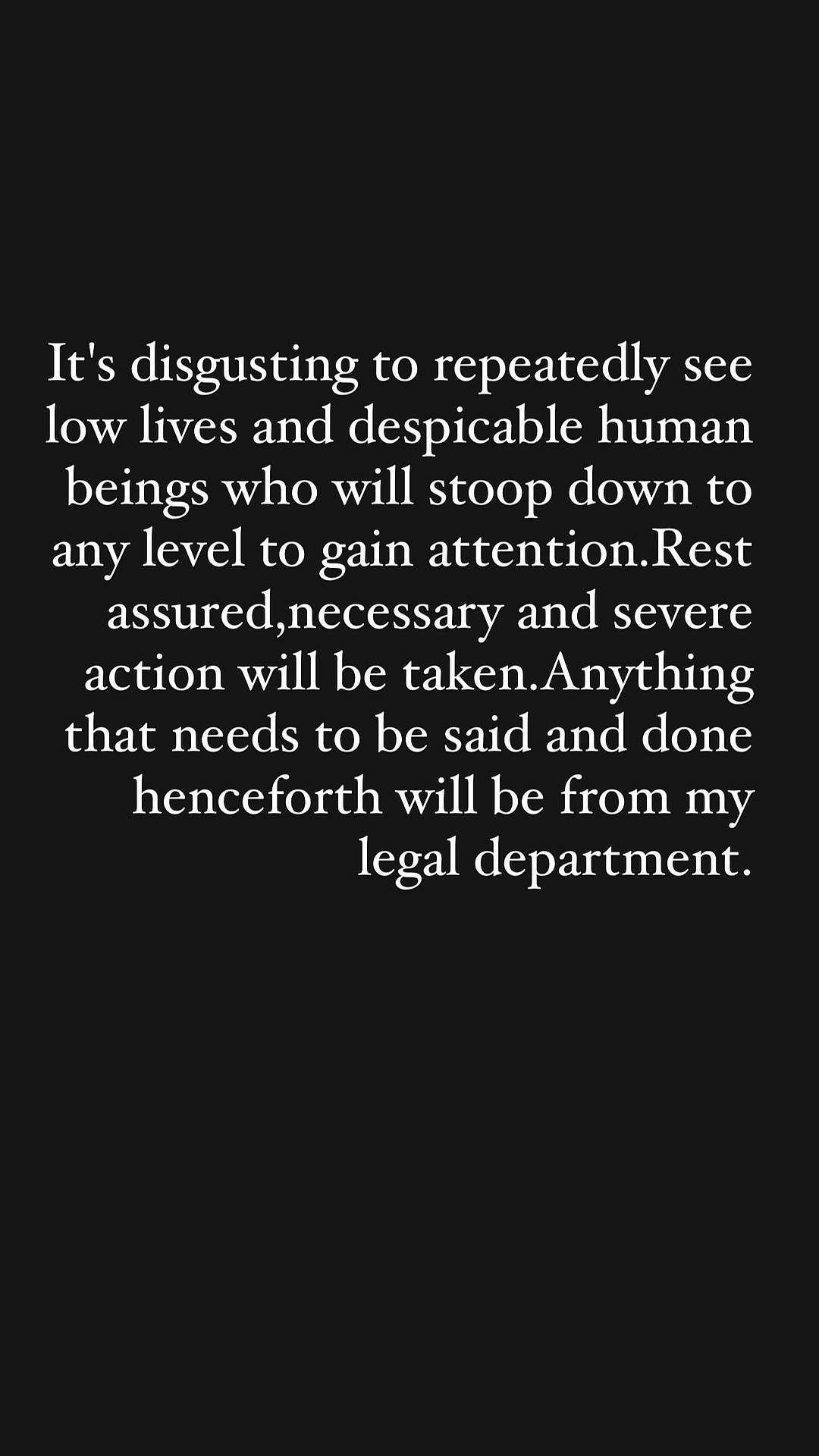 நடிகை த்ரிஷா தன் இன்ஸ்டாகிராம் பக்கத்தில், “கேவலமான மனிதர்களைத் திரும்ப திரும்ப பார்ப்பது அருவருப்பாக இருக்கிறது. இதற்காக, கடுமையான நடவடிக்கைகள் எடுக்கப்படும்.” எனத் தெரிவித்தார்.