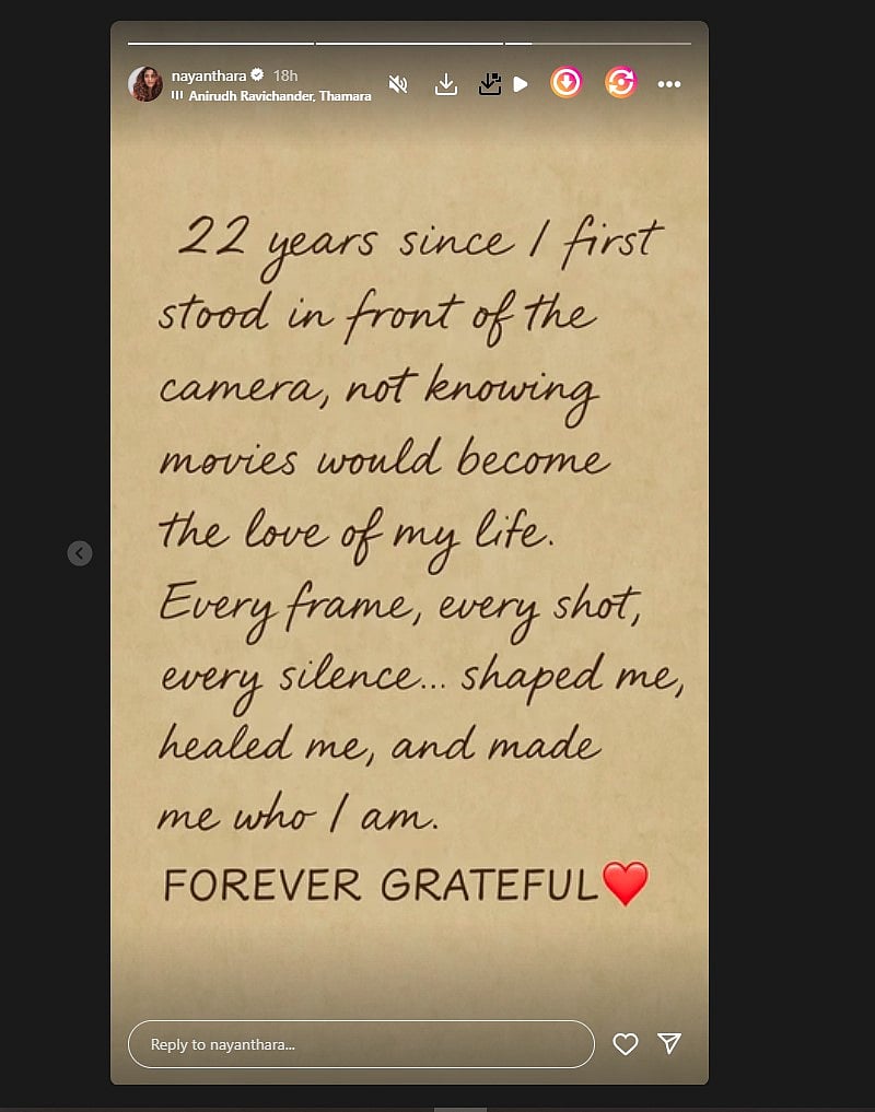 நயன்தாரா வெளியிட்டுள்ள பதிவில், “கேமராவுக்கு முன் வந்து நின்று 22 ஆண்டுகள் ஆகிவிட்டன. ஆனால், திரைப்படங்கள் என் வாழ்க்கையின் காதலாக மாறும் என்று எனக்குத் தெரியாது.