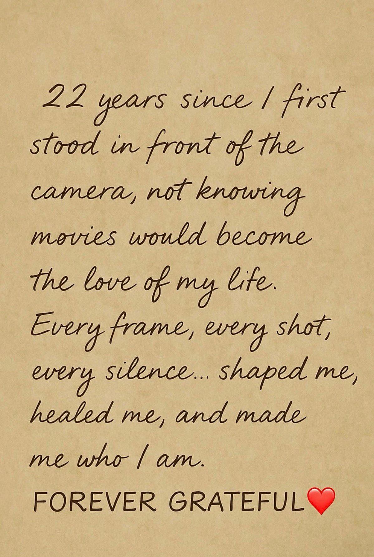 ஒவ்வொரு ஃபிரேமும், ஒவ்வொரு ஷாட்டும், ஒவ்வொரு அமைதியும் என்னை வடிவமைத்து, என்னை குணப்படுத்தி, நான் யார் என்பதை உருவாக்கியிருக்கிறது. என்றென்றும் நன்றியுடன்!” எனக் குறிப்பிட்டுள்ளார்.