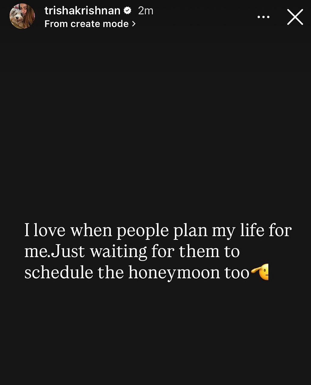 அந்தப் பதிவில், “என்னுடைய வாழ்க்கையைப் பிறர் திட்டமிடுவது எனக்கு மிகவும் பிடிக்கும். எனது தேனிலவையும் திட்டமிட்டு கொடுப்பார்கள் என காத்திருக்கிறேன்” என கிண்டலாகக் குறிப்பிட்டுள்ளார் திரிஷா.