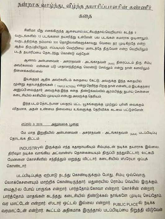 ஆனால் அன்பானவன் அசராதவன் அடங்காதவன் படம், சிம்பு அவர்களால் என்னைப் படுபாதாளத்துக்குக் கொண்டு செல்லும் என்று நான் கனவிலும் நினைக்கவில்லை. இந்தப் படம் தொடர்பான பலதரப்பட்ட யூகங்களுக்கு முற்றுப்புள்ளி வைக்கும் விதமாக, அதன் உண்மை நிலையை உங்களுக்குத் தெரிவிக்கக் கடமைப்பட்டுள்ளேன்.