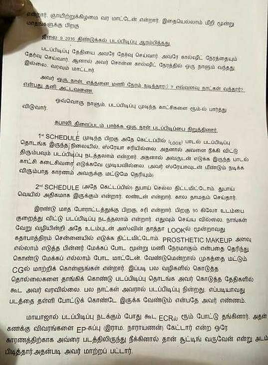 முதல் ஷெட்யூல் முடிந்தபிறகு, ஸ்ரேயா சரியில்லை. அவரை நீக்கிவிட்டு திரும்பவும் படப்பிடிப்பு நடத்தலாம் என்றார். அதனால் அவருடன் இருந்த பாடலை கடைசிவரை எடுக்கமுடியவில்லை.