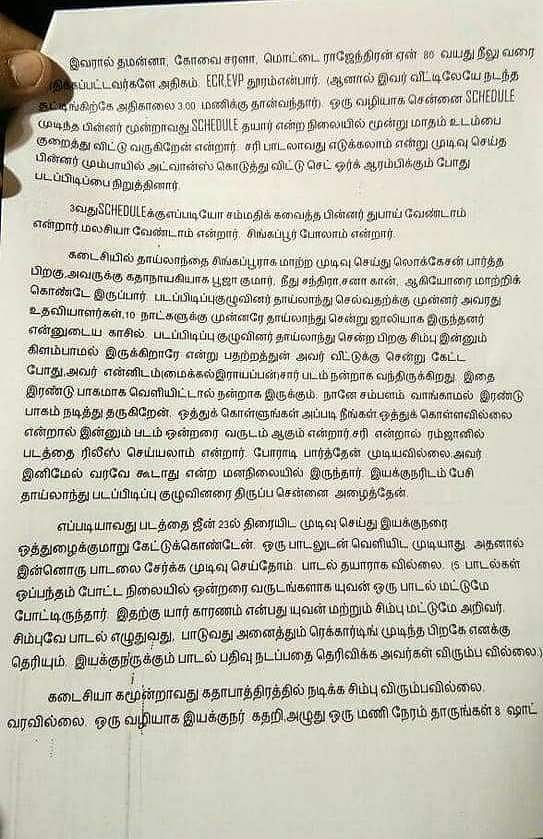 படப்பிடிப்பு ஏற்பாடு செய்யும்போது ஒவ்வொரு லொகேஷனையும் மாற்றினார் சிம்பு. ஜூலை மாதம் திண்டுக்கல்லில் படப்பிடிப்பு ஆரம்பமானது. படப்பிடிப்புத் தேதியை அவரே தேர்வு செய்வார். அவரே கால்ஷீட் நேரத்தையும் தேர்வு செய்வார். ஆனால் அவர் சொன்ன கால்ஷீட் நேரத்தில் ஒருநாளும் வந்தது இல்லை. வரவும் மாட்டார். கபாலி படம் பார்க்க ஒருநாள் படப்பிடிப்பை நிறுத்தினார்.