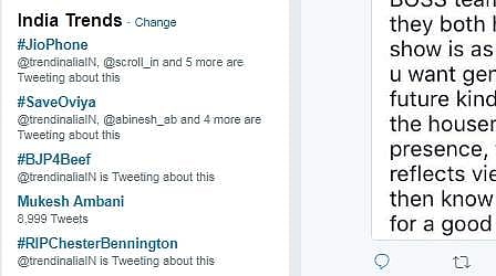 இந்நிலையில் ட்விட்டர் தளத்தில் இந்தச் சர்ச்சை குறித்து ஓவியா ரசிகர்களின் ட்வீட்கள் அதிகமாக வெளிவருகின்றன. சேவ்ஓவியா என்கிற ஹேஷ்டேக்குடன் பலரும் ஓவியாவுக்கு ஆதரவாகவும் அவரை எதிர்க்கும் போட்டியாளர்களுக்கு எதிராகவும் ட்வீட்களை வெளியிட்டு வருகிறார்கள். இதனால் சமீபத்திய நிலவரத்தின்படி சேவ்ஓவியா என்கிற ஹேஷ்டேக் இந்திய அளவில் 2-ம் இடத்தை, ஜியோபோன் செய்திகளுக்கு அடுத்ததாக இடம்பிடித்துள்ளது.