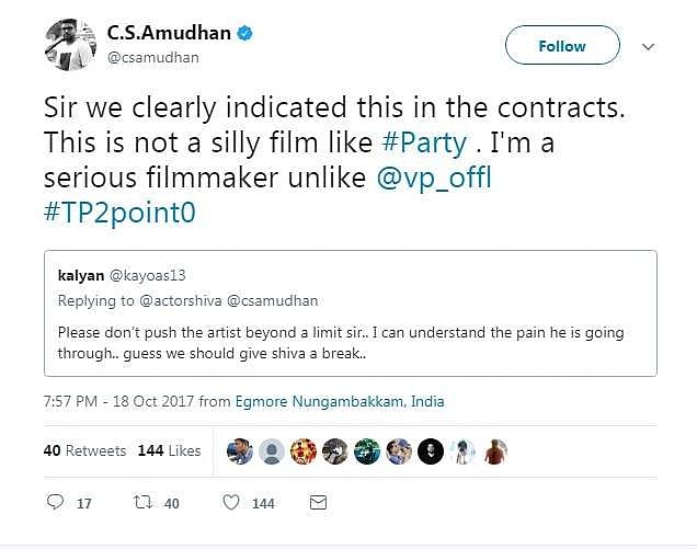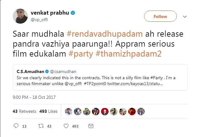 இதற்கு உடனே கடுமையாக பதில் அளித்திருந்த வெங்கட் பிரபு,'முதலில் ரெண்டாவது படம் திரைப்படத்தை வெளியிடும் வேலையை பாருங்க; பிறகு சீரியஸான படம் எடுக்கலாம் என்று தெரிவித்திருந்தார்.