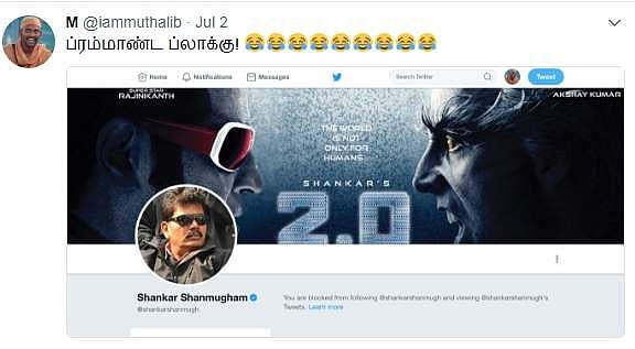 பொதுவாக இதுபோன்று வரும் மறுமொழிகளைத் திரையுலகப் பிரபலங்கள் கண்டுகொள்ளமாட்டார்கள். ஆனால் இயக்குநர் ஷங்கர், அப்துல் முத்தலிப்-பின் ஐடியை பிளாக் செய்துவிட்டார். இதனால் ஷங்கரின் ட்வீட்களை அப்துல் முத்தலிப்பால் இனி பார்க்கமுடியாது. கேள்வியும் கேட்கமுடியாது.