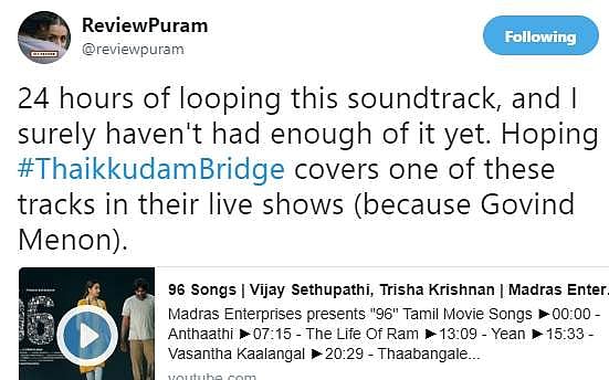 இப்படப் பாடல்கள் ரசிகர்களை மிகவும் கவர்ந்துள்ளன. கேட்கக் கேட்க ஆனந்தமாக உள்ளன, மீண்டும் மீண்டும் கேட்கத் தூண்டுகின்றன என்று பலரும் பாராட்டு தெரிவித்துள்ளார்கள். இதனால் 96 படம் மீதான எதிர்பார்ப்பு மேலும் அதிகமாகியுள்ளது. செப்டம்பர் 7 அன்று 96 படம் வெளிவரவுள்ளது.