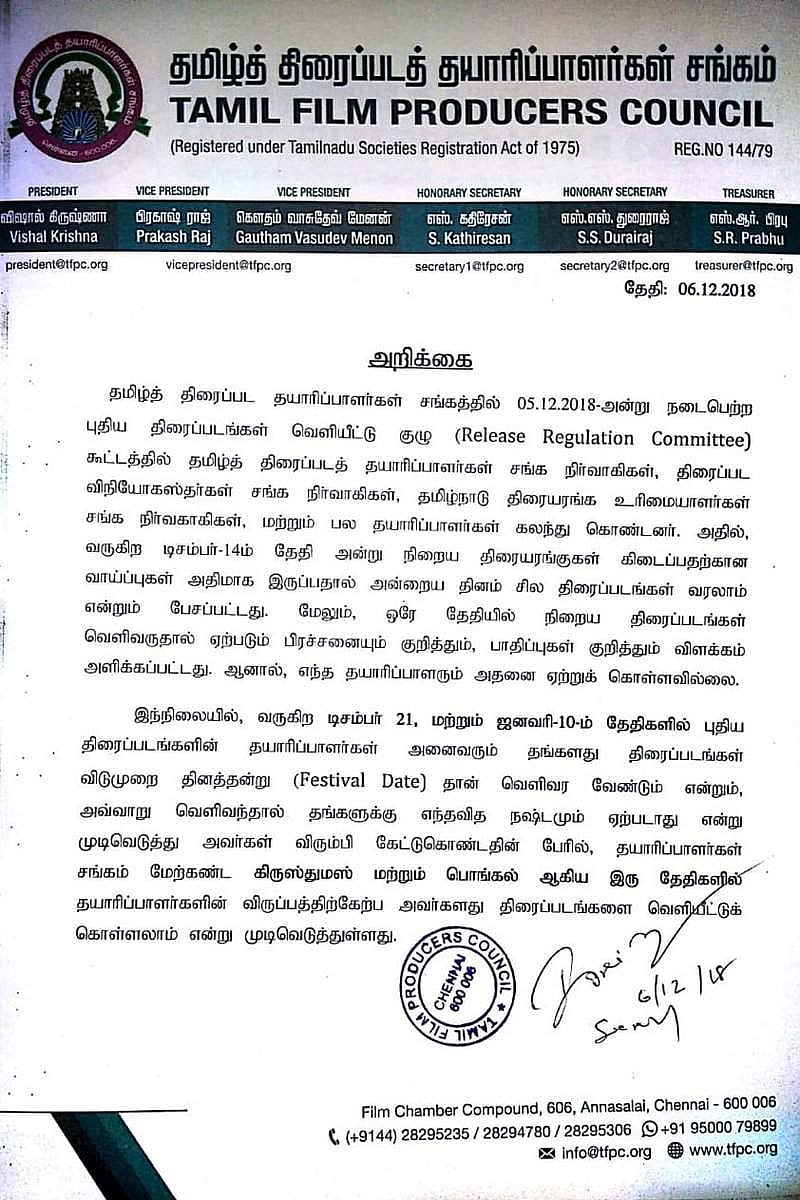 டிசம்பர் 21 மற்றும் பொங்கல் சமயங்களில் ஏராளமான பெரிய படங்கள் வெளிவரத் திட்டமிட்டுள்ளன. இப்படிச் செய்தால் சிறிய படங்களுக்குத் திரையரங்குகள் கிடைப்பதில் சிக்கல் ஏற்படும் என்று புகார் அளிக்கப்பட்டது. இதையடுத்து புதிய திரைப்படங்கள் வெளியீட்டுக் குழு கூட்டம் சென்னையில் நடைபெற்றது. இதில் தயாரிப்பாளர்கள், விநியோகஸ்தர்கள், திரையரங்கு உரிமையாளர்கள், தயாரிப்பாளர்கள் சங்க உறுப்பினர்கள் எனப் பல தரப்பினரும் கலந்துகொண்டார்கள். ஒரே தேதியில் பல படங்கள் வெளியாவதால் உண்டாகும் பாதிப்புகள் குறித்து இந்தக் கூட்டத்தில் எடுத்துரைக்கப்பட்டது. ஆனால் இதை எந்தத் தயாரிப்பாளரும் ஏற்றுக்கொள்ளவில்லை. இதையடுத்து கிறிஸ்துமஸ் மற்றும் பொங்கல் சமயங்களில் தயாரிப்பாளர்கள் அவர்களின் விருப்பத்துக்கேற்ப படங்களை வெளியிட்டுக்கொள்ளலாம் என்று தயாரிப்பாளர் சங்கம் அறிவித்துள்ளது.