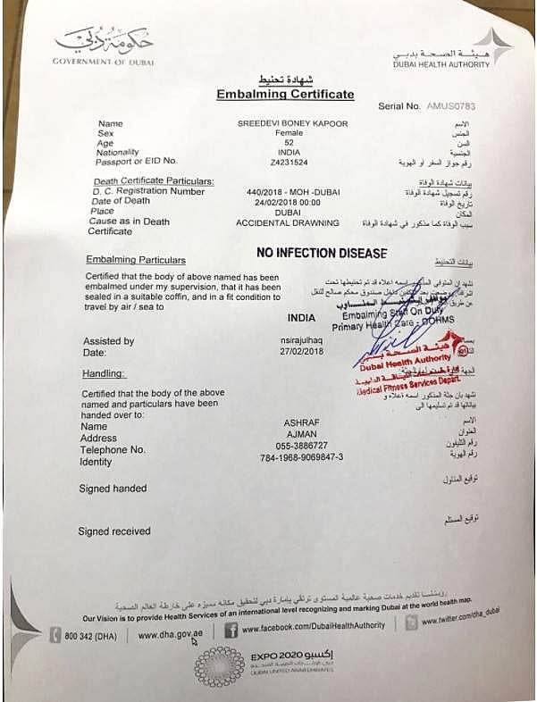 இந்நிலையில் ஸ்ரீதேவி உடல் அவருடைய குடும்ப உறுப்பினர்களிடம் ஒப்படைக்கப்பட்டுள்ளது. இதையடுத்து அவரது உடல் எம்பாமிங் செய்வதற்காக முஹைஸ்னா நகருக்குக் கொண்டு செல்லப்பட்டது. தற்போது மெடிகல் ஃபிட்னஸ் சென்டரில் எம்பாமிங் முடிந்த நிலையில் துபை விமான நிலையத்துக்குக் கொண்டுவரப்படுகிறது. எம்பாமிங் சான்றிதழ் கல்ஃப் நியூஸ் ஊடகத்தில் வெளியாகியுள்ளது.