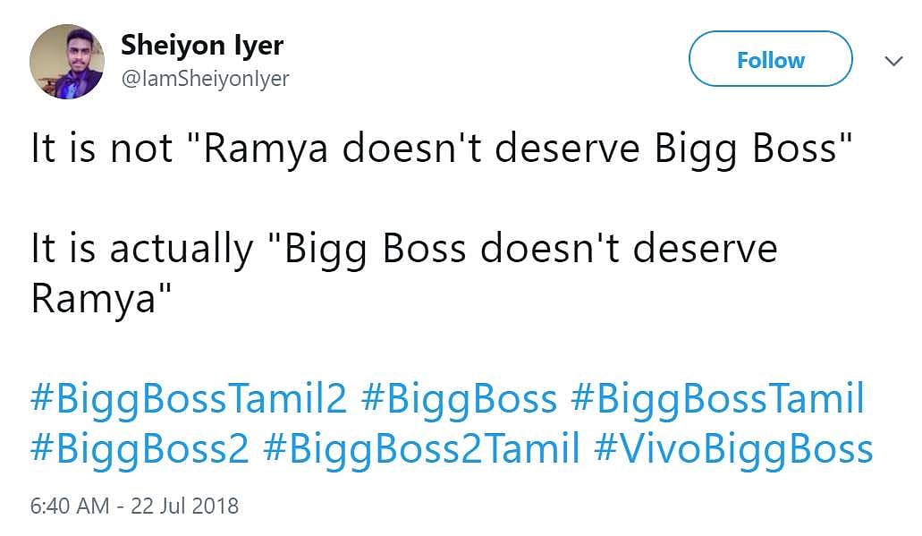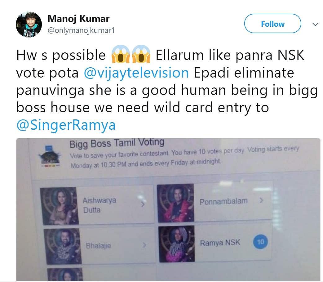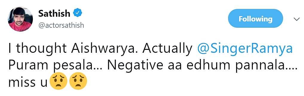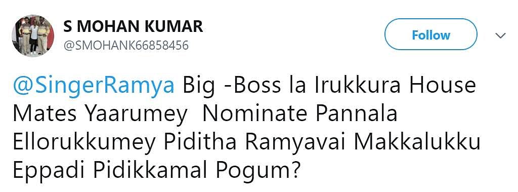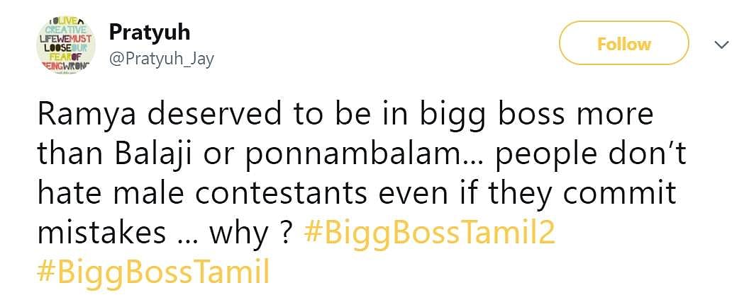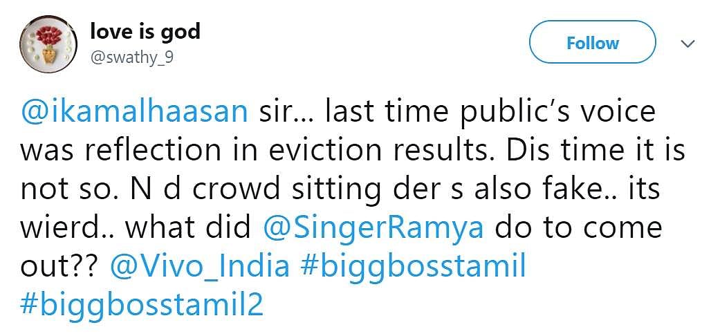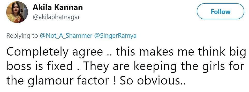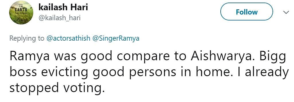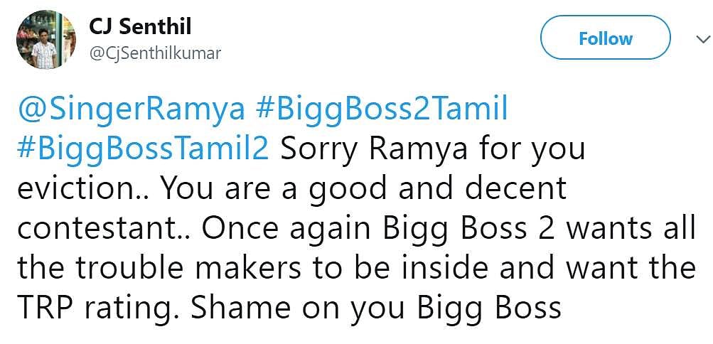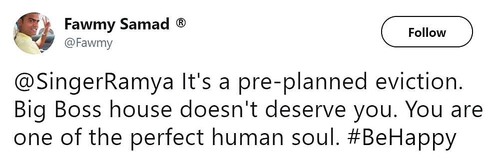 இதில் உள்ள மற்றொரு ஆச்சர்யம், ரசிகர்களின் இந்தக் கருத்துகளை பாடகி ரம்யா தனது ட்விட்டர் பக்கத்தில் ரீட்வீட் செய்திருப்பதுதான். இதையடுத்து பிக் பாஸின் முடிவு ரம்யாவுக்கும் ஏமாற்றத்தை அளித்திருப்பதை இதன்மூலம் அறிந்துகொள்ள முடிகிறது. நடிகர் சதீஷ், பாடகர் கிருஷ் ஆகியோரும் ரம்யாவின் வெளியேற்றத்துக்குத் தங்களின் அதிருப்தியைத் தெரிவித்துள்ளார்கள்.
