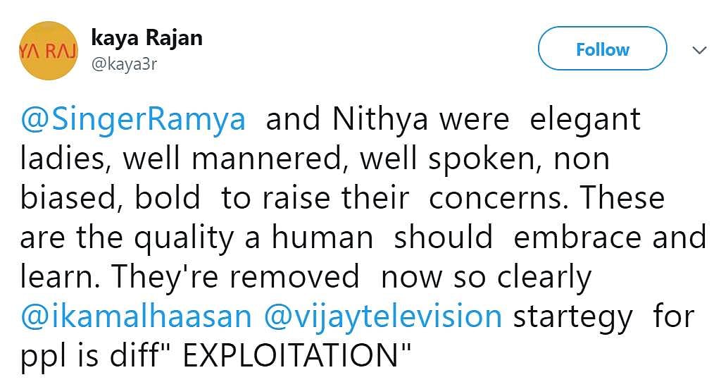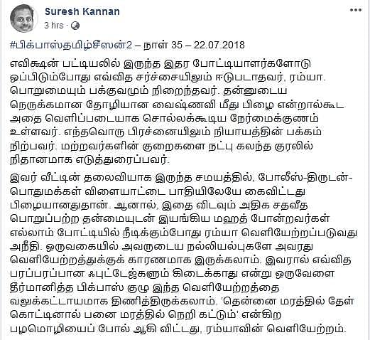 இந்நிலையில் பாடகி ரம்யா இந்த வாரம் வெளியேற்றப்பட்டது ரசிகர்களிடம் விமரிசனங்களை வரவழைத்துள்ளது. இந்நிகழ்ச்சியில் புறம்பேசாத போட்டியாளராக உள்ளவர்கள் இருவர் மட்டுமே. ரம்யாவும் ரித்விகாவும். இந்நிலையில் ரம்யா வெளியேற வேண்டும் என்று ரசிகர்கள் விருப்பப்பட்டதாக முடிவு அறிவிக்கப்பட்டு நேற்று ரம்யா நிகழ்ச்சியிலிருந்து வெளியேற்றப்பட்டது ரசிகர்களுக்குப் புதிராக அமைந்துள்ளது. இதையடுத்து பிக் பாஸ் நிகழ்ச்சி மற்றும் விஜய் டிவிக்கு எதிராகப் பலர் சமூகவலைத்தளங்களில் தங்களுடைய கருத்துகளை வெளிப்படையாகத் தெரிவித்துள்ளார்கள். இந்த விவகாரத்தில் கமல் மீதும் விமரிசனங்கள் வைக்கப்பட்டுள்ளன.