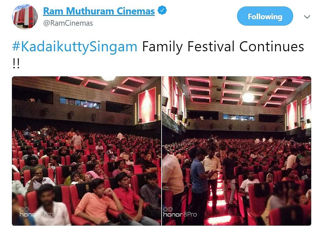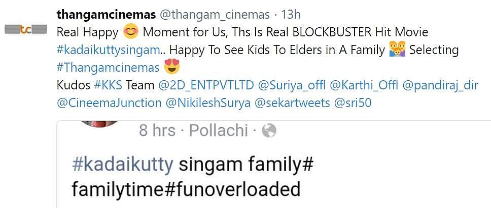மேலும் நேற்று (ஞாயிறு) தமிழகம் முழுக்க 151 திரையரங்குகள் அரங்கு நிறைந்த காட்சிகளாக ஓடியுள்ளது. அதாவது தமிழ்நாட்டில் வெளியான 358 திரையரங்குகளில் 151 திரையரங்குகள் ஜனத்திரளில் மூழ்கியுள்ளன. இத்தனைக்கும் நேற்று பட வெளியீட்டின் 10-வது நாள். சென்னையில் 22 திரையரங்குகளில் வெளியான நிலையில் 20 திரையரங்குகளில் நேற்று மாலை அரங்கு நிறைந்த காட்சிகள்! இதனால் இந்த வருடத்தின் முதல் சூப்பர் ஹிட் படம் என திரையுலகம் கொண்டாடும் படமாக உள்ளது கடைக்குட்டி சிங்கம்.