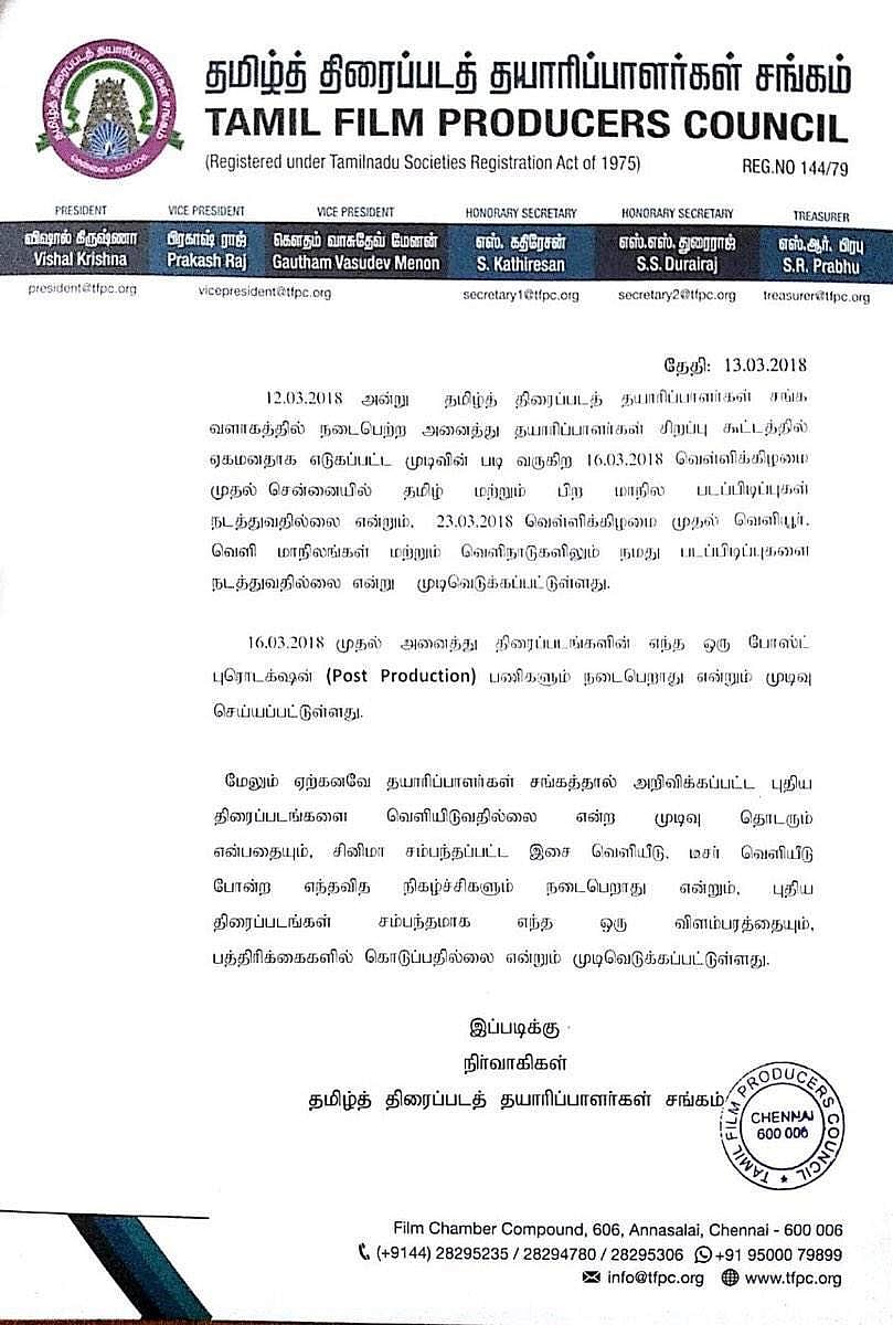 இந்நிலையில் வேலைநிறுத்தம் நடைபெறுகிறபோது, சினிமா சம்பந்தப்பட்ட இசை வெளியீடு, டீசர் வெளியீடு போன்ற எந்த நிகழ்ச்சிகளும் நடைபெறாது என்றும் புதிய திரைப்படங்கள் சம்பந்தமாக எந்தவொரு விளம்பரத்தையும் பத்திரிகைகளுக்குக் கொடுப்பதில்லை என்றும் முடிவெடுக்கப்பட்டுள்ளதாக தமிழ்த் திரைப்படத் தயாரிப்பாளர்கள் சங்கம் தனது புதிய அறிக்கையில் தகவல் தெரிவித்துள்ளது.