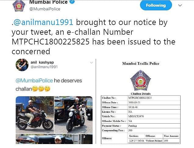 குனால் கெமுவுக்கு ரூ. 500 அபராதம் விதித்து சலான் அனுப்பப்பட்டுள்ளது. இதற்கான இ-சலான் ட்விட்டரில் வெளியிடப்பட்டுள்ளது.