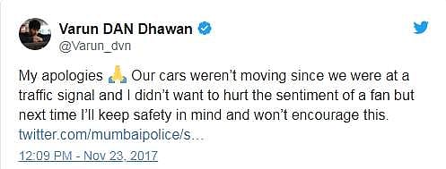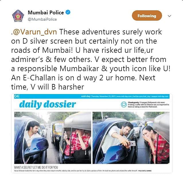 இதற்கு முன்பு காரில் இருந்தபடி ஆட்டோவில் பயணித்த ரசிகையுடன் இணைந்து மும்பை சாலையில் செல்பி புகைப்படத்தை எடுத்துக்கொண்டார் நடிகர் வருண் தவன். இதன் புகைப்படம் ஊடகங்களில் வெளியானதை முன்வைத்து அவருக்கு அபராதம் விதித்தது மும்பைக் காவல்துறை. சீட்பெல்ட் அணியாமல் இருந்ததற்கும் சேர்த்து அபராதம் விதிக்கப்பட்டது. அடுத்ததாக புகைப்படங்களை முன்வைத்து நடிகர் குனால் கெமு மீது நடவடிக்கை எடுக்கப்பட்டுள்ளது.