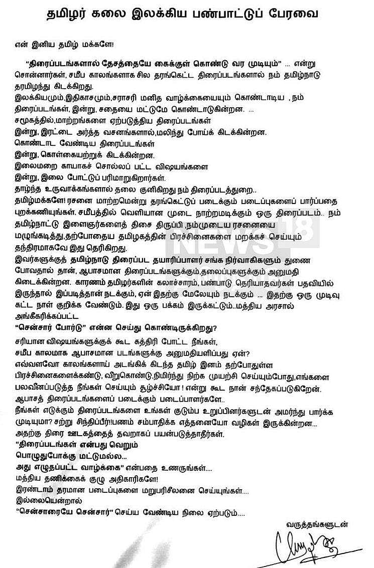 தமிழ் மக்களே, ரசனை மாற்றமென்று தரங்கெட்டுப் படைக்கும் படைப்புகளைப் பார்ப்பதைப் புறக்கணியுங்கள். சமீபத்தில் வெளியான முடை நாற்றமடைக்கும் ஒரு திரைப்படம், நம் தமிழ்நாட்டு இளைஞர்களைத் திசை திருப்பி, நம்முடைய ரசனையை மழுங்கடித்து, தற்போதைய தமிழகத்தின் பிரச்னைகளை மறக்கச் செய்யும் தந்திரமாகவே இது தெரிகிறது. இவர்களுக்குத் தமிழ்நாடு திரைப்பட தயாரிப்பாளர் சங்க நிர்வாகிகளும் துணை போவதால்தான் ஆபாசமான திரைப்படங்களுக்கும் தலைப்புகளுக்கும் அனுமதி கிடைக்கின்றன. காரணம், தமிழர்களின் கலாசாரம், பண்பாடு தெரியாதவர்கள் பதவியில் இருந்தால் இப்படித்தான் நடக்கும். ஏன் இதற்கு மேலேயும் நடக்கும். இதற்கு ஒரு முடிவு கட்ட நாள் குறிக்க வேண்டும். மத்திய அரசால் அங்கீகரிக்கப்பட்ட சென்சார் போர்டு என்ன செய்துகொண்டிருக்கிறது? சரியான விஷயங்களுக்குக்கூட கத்திரி போட்ட நீங்கள் சமீபகாலமாக ஆபாசமான படங்களுக்கு அனுமதியளிப்பது ஏன்? இரண்டாம் தரமான படைப்புகளை மறுபரிசீலனை செய்யுங்கள். இல்லையென்றால் சென்சாரையே சென்சார் செய்ய வேண்டிய நிலை ஏற்படும் என்று அறிக்கையில் தெரிவித்துள்ளார்.