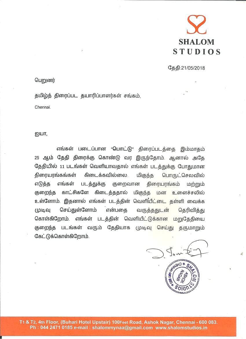 பொட்டு படம் இம்மாதம் 25-ம் தேதி வெளியாவதாக இருந்தது. ஆனால் அதே தேதியில் 11 திரைப்படங்கள் வெளியாவதால் எங்கள் படத்துக்குப் போதுமான திரையரங்குகள் கிடைக்கவில்லை. மிகுந்த பொருட்செலவில் எடுத்த எங்கள் படத்துக்குக் குறைவான திரையரங்கம் மற்றும் குறைந்த காட்சிகளே கிடைத்ததால் மிகுந்த மன உளைச்சலில் உள்ளோம். இதனால் எங்கள் படவெளியீட்டைத் தள்ளி வைக்க முடிவு செய்துள்ளோம். எங்கள் படத்தின் வெளியீட்டுக்கான மறுதேதியைக் குறைந்த படங்கள் வரும் தேதியாக முடிவு செய்து தருமாறு கேட்டுக்கொள்கிறோம் என்று கடிதத்தில் கூறப்பட்டுள்ளது.