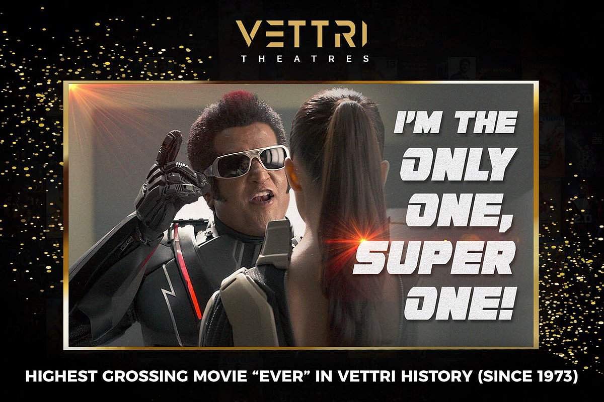 ஷங்கர் இயக்கத்தில் ரஜினி, அக்ஷய் குமார் நடித்துள்ள 2.0 படம் இன்று 50-வது நாளைக் கொண்டாடுகிறது. இந்த நாளில் அவர் அளித்த தகவலின்படி, குரோம்பேட்டை வெற்றி திரையரங்கில் இதுவரை வெளியான படங்களில் அதிகமாக வசூலித்தது 2.0 படம்தான் என்கிற தகவலை ராகேஷ் கெளதமன் வெளியிட்டுள்ளார். இந்த வசூல் தொகையில் 3டி கண்ணாடிகளின் வருமானம் சேர்க்கப்படவில்லை என்றும் அவர் கூறியுள்ளார்.