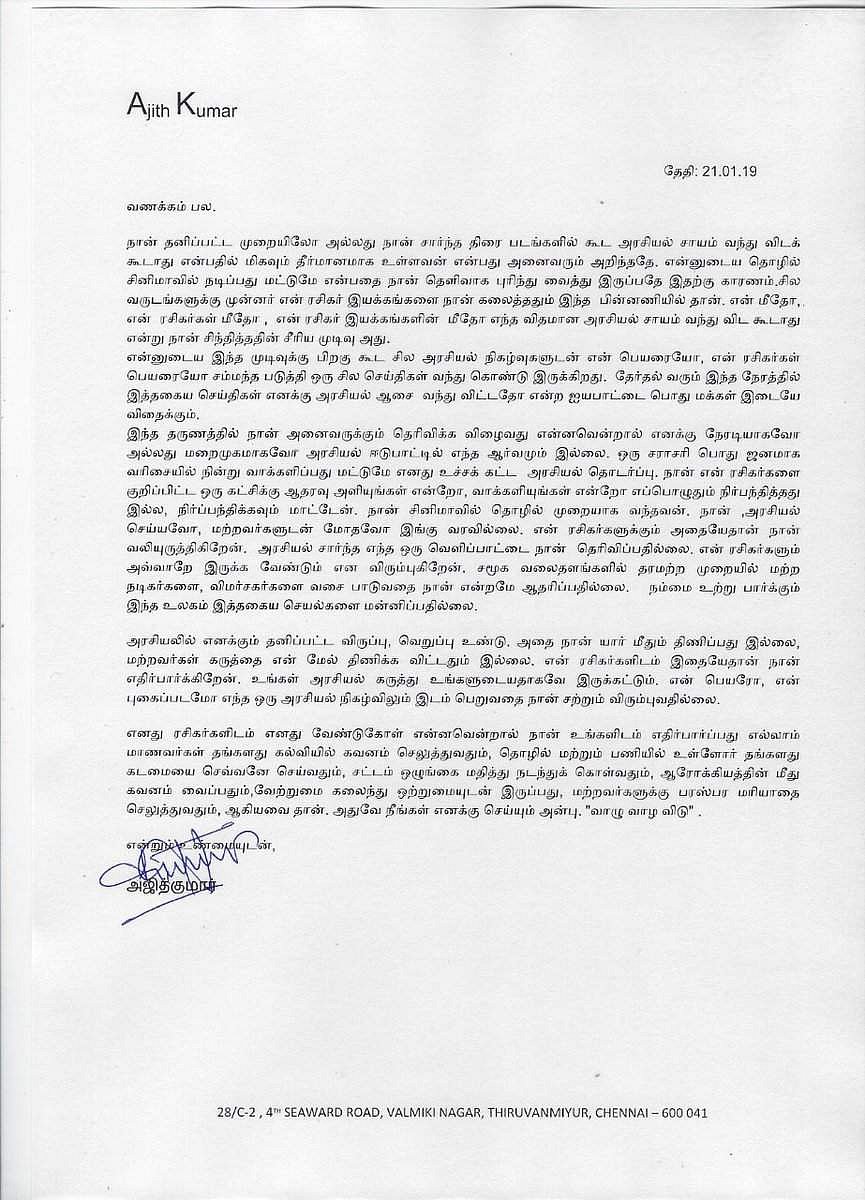 சில நாட்களுக்கு முன்னால் அஜித் ரசிகர்கள் 5000 பேர் பாஜக தமிழ் மாநிலத் தலைவர் தமிழிசை சவுந்தரராஜன் முன்னிலையில் பாஜகவில் இணைந்ததாகவும், அவர்கள் அஜித் ரசிகர்கள் என்ற தரப்பில் இருந்து பாஜகவுக்கு ஆதரவு தருவதாகவும் செய்திகள் வெளியாகின.