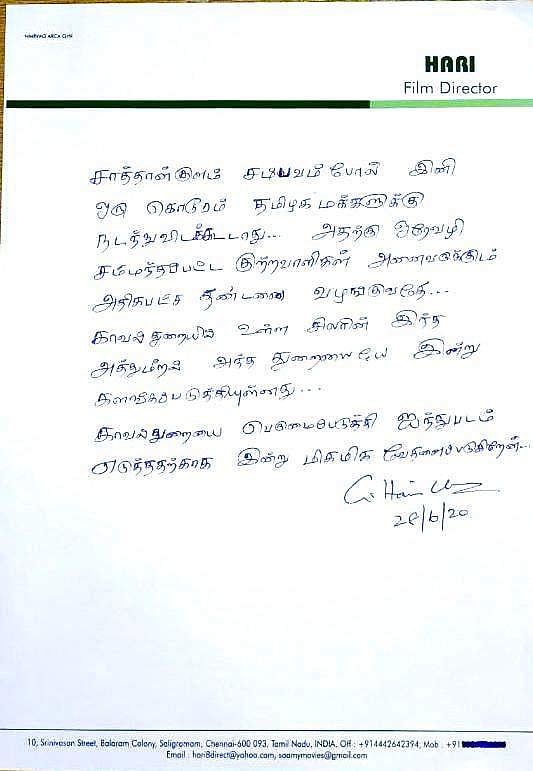 இந்நிலையில் இயக்குனர் ஹரி, 'சாத்தான்குளம் சம்பவம்போல் இனி ஒரு கொடூரம் தமிழக மக்களுக்கு நடந்துவிடக்கூடாது. அதற்கு ஒரேவழி சம்மந்தப்பட்ட குற்றவாளிகள் அனைவருக்கும் அதிகபட்ச தண்டனை வழங்குவதே.. காவல்துறையில் உள்ள சிலரின் இந்த அத்துமீறல் அந்த துறையையே இன்று களங்கப்படுத்தியுள்ளது.