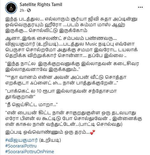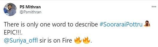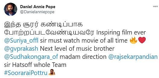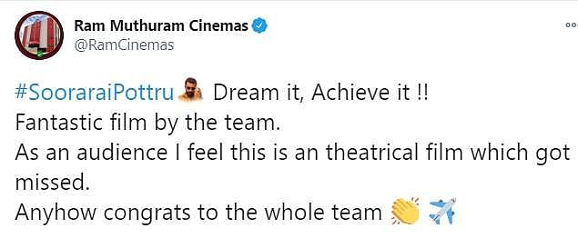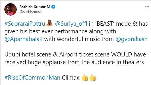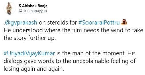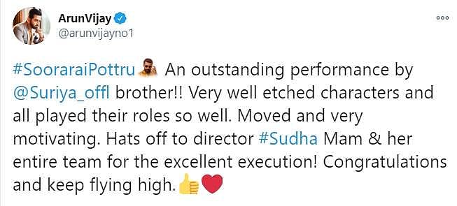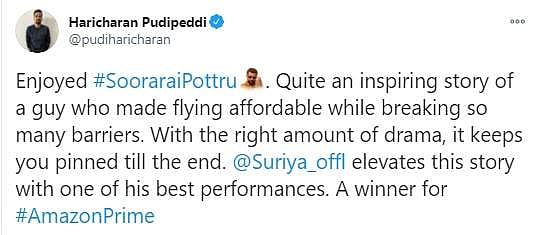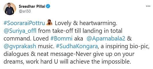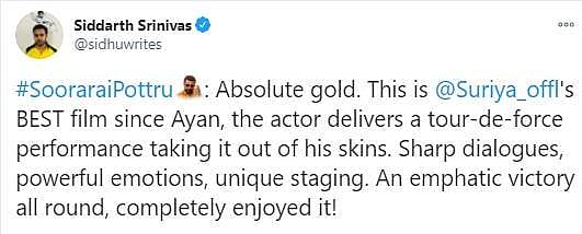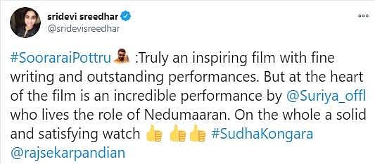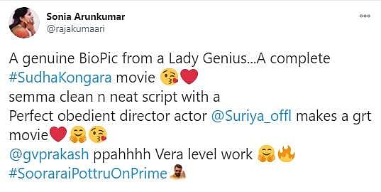 நேற்றிரவு அமேசான் பிரைம் ஓடிடி தளத்தில் சூரரைப் போற்று படம் வெளியானது. இதையடுத்து ரசிகர்கள், திரைப்பட விமர்சகர்கள், திரையுலகினர் எனப் பலரும் படத்தையும் சூர்யாவின் நடிப்பையும் இயக்குநர் சுதா கொங்கராவின் திறமையையும் பாராட்டி சமூகவலைத்தளங்களில் பதிவுகள் எழுதியுள்ளார்கள். அதன் தொகுப்பு: