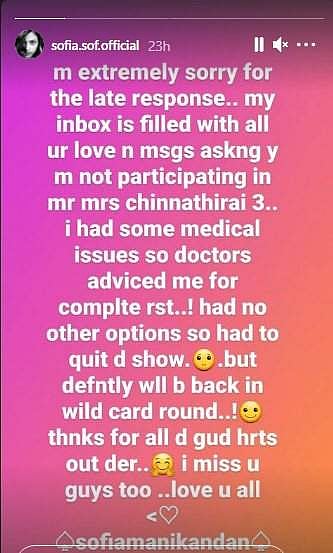 அதில், எனக்கு உடல் நிலை சரியில்லை. மருத்துவர்கள் ஓய்வெடுக்க சொல்லியிருக்கிறார்கள். அதனால் நிகழ்ச்சியை விட்டு விலகுவதைத் தவிர வேறு வழியில்லை. வைல்டு கார்டு மூலம் மீண்டும் நிகழ்ச்சிக்கு வருவேன்'' என்று தெரிவித்துள்ளார்.