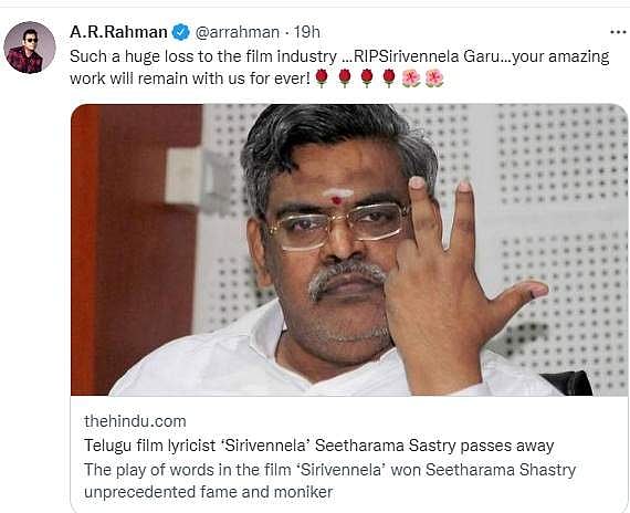 பிரபல பாடலாசிரியரின் மறைவுக்கு இசையமைப்பாளர் ஏ.ஆர்.ரஹ்மான் இரங்கல் தெரிவித்துள்ளார்.