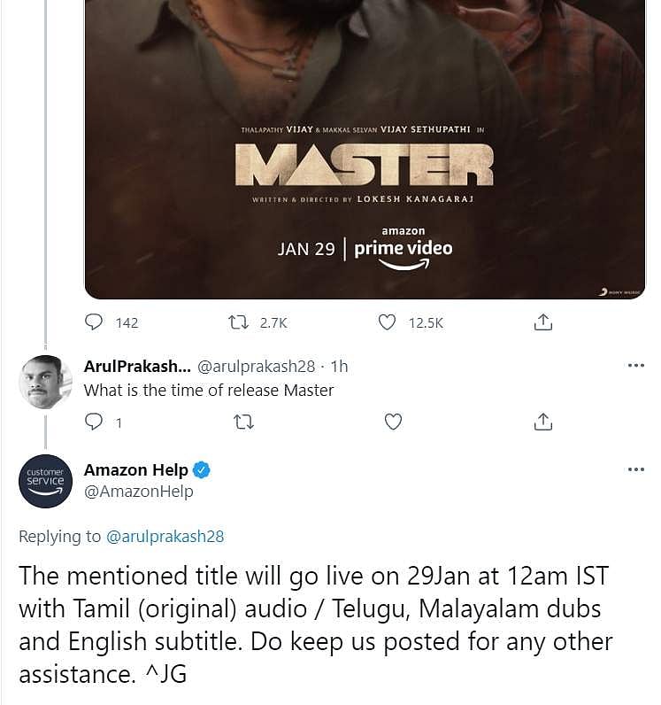 இந்நிலையில் மாஸ்டர் படம் வெளியாகும் நேரத்தை அறிவித்துள்ளது அமேசான் பிரைம் நிறுவனம். ட்விட்டரில், மாஸ்டர் படம் வெளியாகும் நேரம் குறித்து ரசிகர் ஒருவர் கேள்வி எழுப்பியிருந்தார். இதற்குப் பதில் அளித்த அமேசான் பிரைம் நிறுவனம், ஜனவரி 29, அதிகாலை 12 மணிக்கு (இந்திய நேரம்) மாஸ்டர் படம் வெளியாகும் எனத் தெரிவித்துள்ளது.