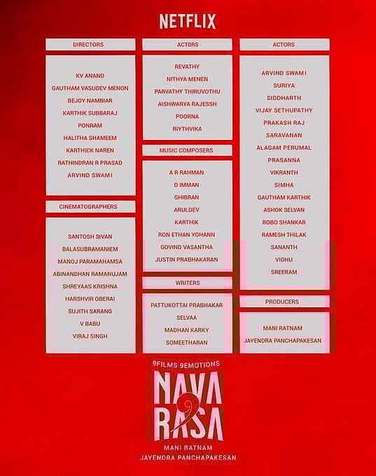 தமிழ்த் திரையுலகின் பிரபல நடிகர்களும் இயக்குநர்களும் ஒன்றிணைந்து நவரசா என்கிற படத்தை உருவாக்கியுள்ளார்கள். பிரபல இயக்குநர் மணி ரத்னமும் ஜெயேந்திராவும் தயாரித்துள்ள இப்படத்தை 9 இயக்குநர்கள் இயக்கியுள்ளார்கள். 9 உணர்வுகளையும் 9 கதைகளையும் கொண்ட இப்படத்தை கெளதம் மேனன், கார்த்திக் சுப்புராஜ், கார்த்திக் நரேன், கே.வி. ஆனந்த், பொன்ராம், ரதிந்திரன், ஹலிதா, பிஜாய் நம்பியார். அரவிந்த் சாமி ஆகியோர் இயக்கியுள்ளார்கள். இந்தப் படம் நெட்பிளிக்ஸ் ஓடிடி தளத்தில் விரைவில் வெளியாகவுள்ளது.
