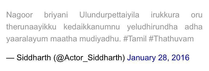 நாக சைதன்யாவை சமந்தா திருமணம் செய்துகொள்வதற்கு முன், சித்தார்த்தும் சமந்தாவும் காதலித்து வந்ததாக கூறப்பட்டது. முன்னதாக சமந்தாவுடன் பிரிவு ஏற்பட்டபோது, நாகூர் பிரியாணி உளூந்தூர்பேட்டையில இருக்குற ஒரு தெரு நாயிற்கு கிடைக்கும் என்று எழுதியிருந்தால் அதனை யாராலும் மாற்ற முடியாது என்று குறிப்பிட்டிருந்தார். இதனையும் ரசிகர்கள் தற்போது பகிர்ந்து வருகின்றனர்.