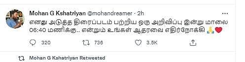 இந்த நிலையில் இயக்குநர் மோகன்.ஜி தனது அடுத்தப் படம் குறித்து சுட்டுரைப் பக்கத்தில் பதிவிட்டுள்ளார். அந்தப் பதிவில், ''எனது அடுத்த திரைப்படம் பற்றிய ஒரு அறிவிப்பு இன்று மாலை 6.40 மணிக்கு வருகிறது. என்றும் உங்கள் ஆதரவை எதிர்நோக்கி'' என்று குறிப்பிட்டுள்ளார்.