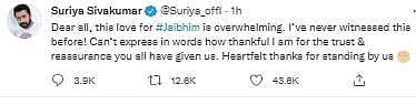 Dear all, this love for #Jaibhim is overwhelming. I’ve never witnessed this before! Can’t express in words how thankful I am for the trust & reassurance you all have given us. Heartfelt thanks for standing by us