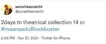 நடிகர் சிம்பு கதாநயாகனாக நடித்து, வெங்கட் பிரபு இயக்கியுள்ள 'மாநாடு' திரைப்படம் இரண்டு நாட்களில் தமிழக அளவில் ரூ.14 கோடி வசூலித்துள்ளதாக தயாரிப்பாளர் சுரேஷ் காமாட்சி அறிவித்துள்ளார்.