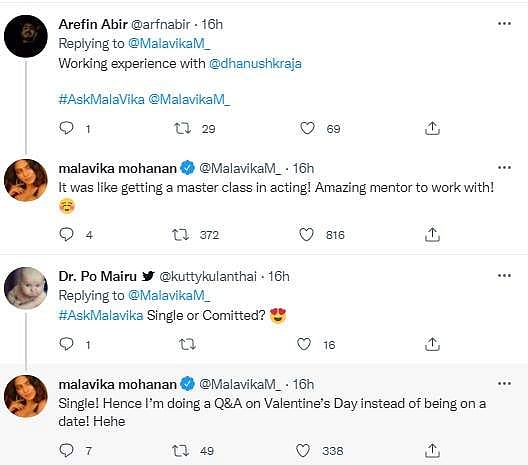 காதலர் தினத்தை முன்னிட்டு நடிகை மாளவிகா மோகனன் தனது ட்விட்டர் பக்கத்தில் ரசிகர்களின் கேள்விகளுக்கு பதிலளித்தார். ஒரு ரசிகர், 'எனக்கு நீங்கள் பதிலளிக்கும்வரை சாப்பிடப்போவதில்லை' என்று தெரிவிக்க, ''சரி, நான் உங்களுக்கு பதிலளிக்கிறேன். காரணம் உணவு மிக முக்கியம்'' என்று பதிலளித்தார்.