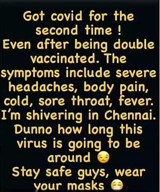 அவர் தனது இன்ஸ்டாகிராம் பக்கத்தில் பகிர்ந்துள்ளதாவது, எனக்கு கரோனா பாதிப்பு ஏற்பட்டுள்ளது. இரண்டு தவனை தடுப்பூசி செலுதித்திக்கொண்ட பிறகும் தொற்று ஏற்பட்டிருக்கிறது. கடுமையான தலைவலி, உடல் வலி, சளி, தொண்டைப் புண், காய்ச்சல் ஆகியவை எனக்கு ஏற்பட்ட அறிகுறிகள்.