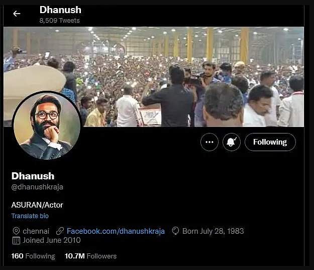 நடிகர் தனுஷ் ட்விட்டரில் தனது படங்களின் பாடல்கள், டிரெய்லர்கள் வெளியாகும்போது மட்டும் பதிவிடுவதை வழக்கமாக கொண்டுள்ளார். தனுஷ் தற்போது சத்யஜோதி பிலிம்ஸ் தயாரிப்பில் அருண் மாதேஸ்வரன் இயக்கத்தில் கேப்டன் மில்லர் படத்தில் நடிக்கிறார்.