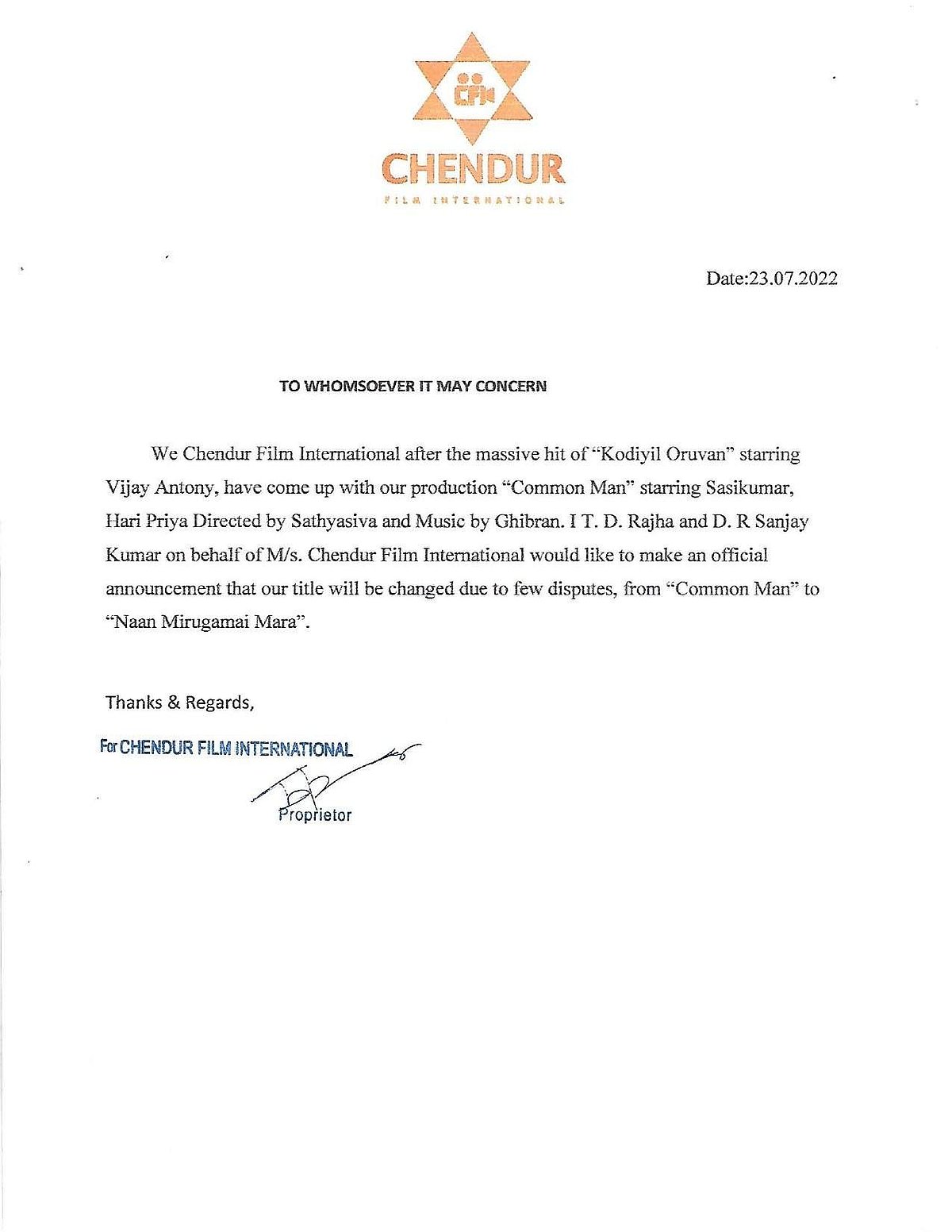 காமன் மேனிலிருந்து நான் மிருகமாய் மாற - சசிகுமார் பட நிறுவனம் அறிவிப்பு