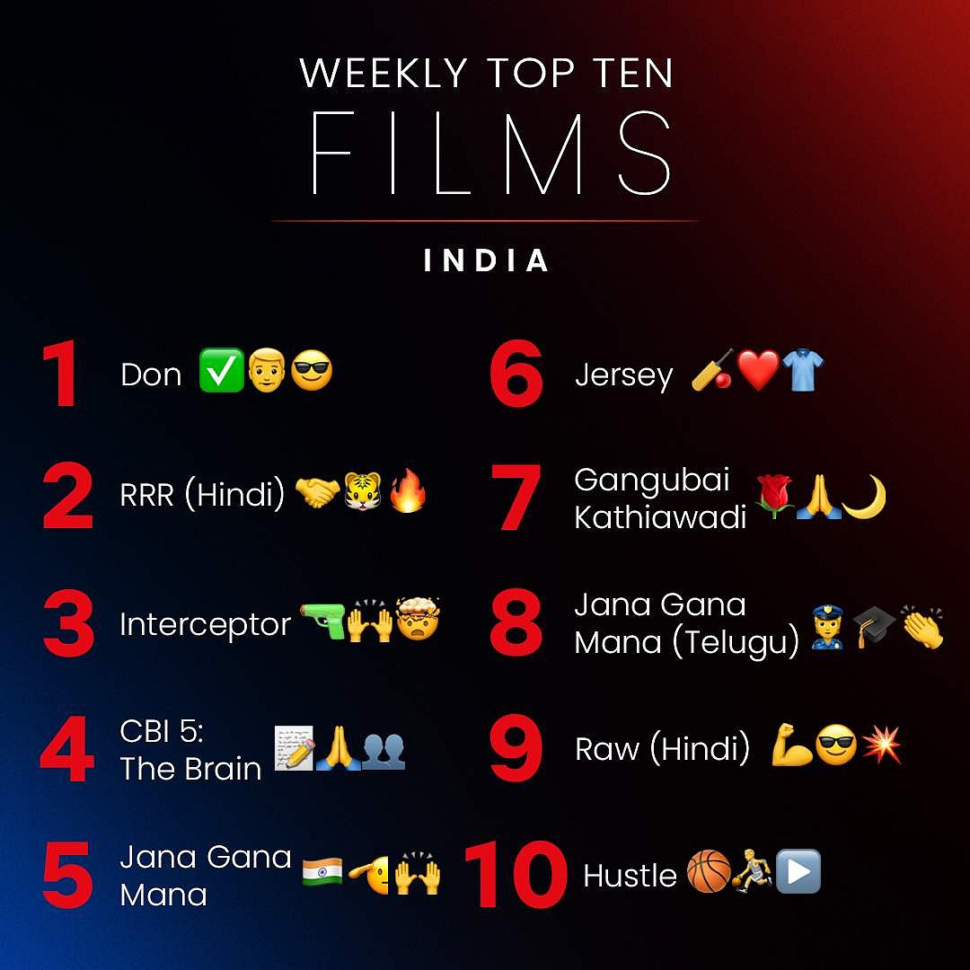அதில் இந்த வாரம் அதிக முறை பார்க்கப்பட்ட படங்களில் பட்டியலில் டான் முதலிடத்தில் உள்ளது. 2வது இடத்தில் ஆர்ஆர்ஆர் பட ஹிந்தி பதிப்பும், 3வது இடத்தில் இண்டர்செப்டர் படமும், 4வது இடத்தில் சிபிஐ 5 தி பிரெய்ன் படமும் 5வது இடத்தில் ஜன கன மன படமும் உள்ளது.