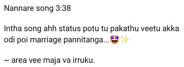 என்னோட பக்கத்து வீட்டு அக்கா 'விடை கொடு சாமி விட்டுப் போகின்றேன்' பாடலை ஸ்டேட்டஸா வெச்சுட்டு ஓடி போயி கல்யாணம் பண்ணிட்டாங்க. ஏரியாவே மஜாவா இருக்கு.
